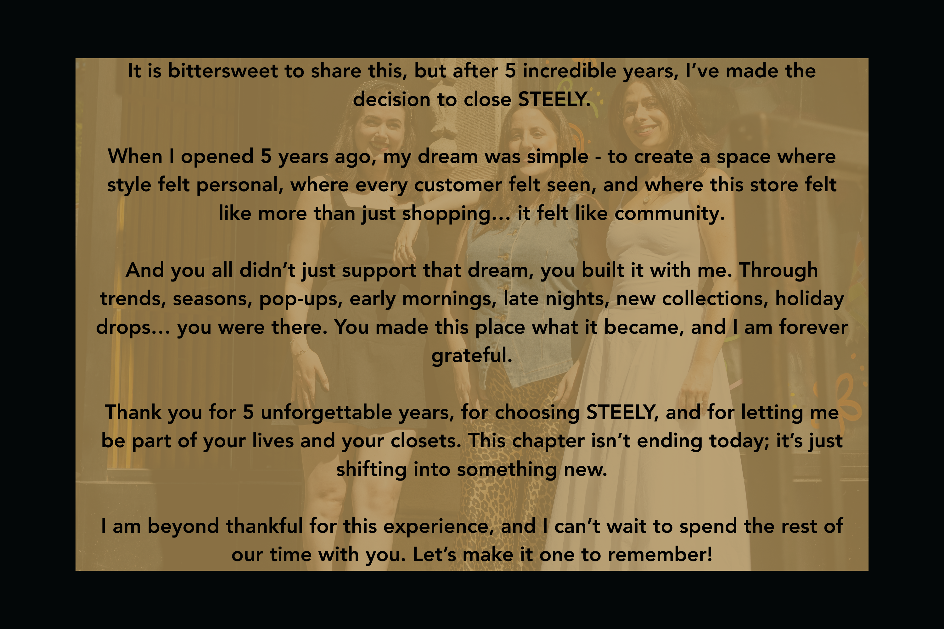 Fashion has always been a part of who I am, but it wasn’t until college—while studying Fashion Merchandising at Ohio State—that I realized I could blend my love for style and numbers into a career. After 8 years in corporate retail, I knew it was time to chase a longtime dream: opening my own boutique. And just like that, STEELY was born!